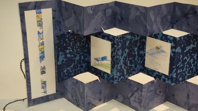 Groepsexpositie met als thema ’Wadanders’ In een vitrinekast stonden leporello’s speciaal voor deze expositie gemaakt met schelpen en wadvogels.