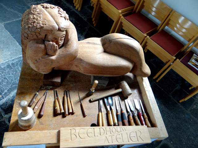 Samen met Annette (leporello's en boekjes) en Marijke Raymakers (handboekbindster zie: www.handboekbinderijdeomslag.nl) sta ik in de Pieterskerk. Ik geef daar demonstraties van 'letterkappen in hout'.