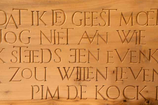 School 7 is de naam van de prachtig verbouwde school naar de mooiste bibliotheek ter wereld! Vorig jaar verwierf deze bieb terecht deze prijs. In dit gebouw exposeer ik mijn letterkapwerk. Op 1 november start de landelijke aktie 'Nederland Leest'. Mij is gevraagd ter opluistering de naam van schrijkver en de titel van het boek, dat gratis uitgedeeld wordt tijdens deze aktie, in hout te hakken. Daarvoor is speciaal een ontwerp gemaakt. Als openingsact zal ik dit ontwerp in hout hakken op 1 november van 11.00 tot 12.00 uur. Op 14 geef ik een volgende demonstratie 'letterkappen' van 14.00 tot 15.00 uur.