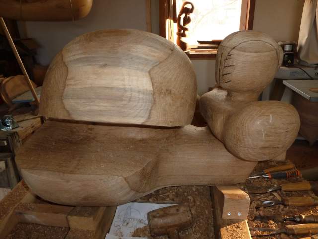 Dat is de uitdaging. Het thema ’moeder en kind’ of ’geborgenheid’ leent zich daar uitstekend voor. Er is een binnenvorm in een buitenvorm verwerkt. Een kind zit veilig bij moeder weggekropen. Dit thema is een oergegeven waar elk mens mee te maken heeft of heeft gehad. Het herbergt gevoelens van liefde, veiligheid en warmte. Deze binnen- en buitenvorm kunnen uit één stuk hout gehakt zijn of uit twee losse stukken.Bij dat laatste doet zich een technisch probleem voor. Ondanks dat ik met ’bestorven’ stukken hout werk, zullen de twee vormen beiden hun eigen krimp en vervorming aannemen. Zelfs als beide stukken uit dezelfde stam gemaakt zijn. Als er twee verschillende houtsoorten gebruikt worden, kunnen de verschillen des te groter worden. Al worden de stukken ’ naadloos passend’ op elkaar gemaakt, dan toch zal na een winter stoken de kier groter worden. Maar hout blijft een levend en deels onvoorspelbaar materiaal: het komt ook voor dat een kier dicht trekt! Hout blijft werken zolang het hout is. De grilligheid van het materiaal kan ook juist van pas komen.